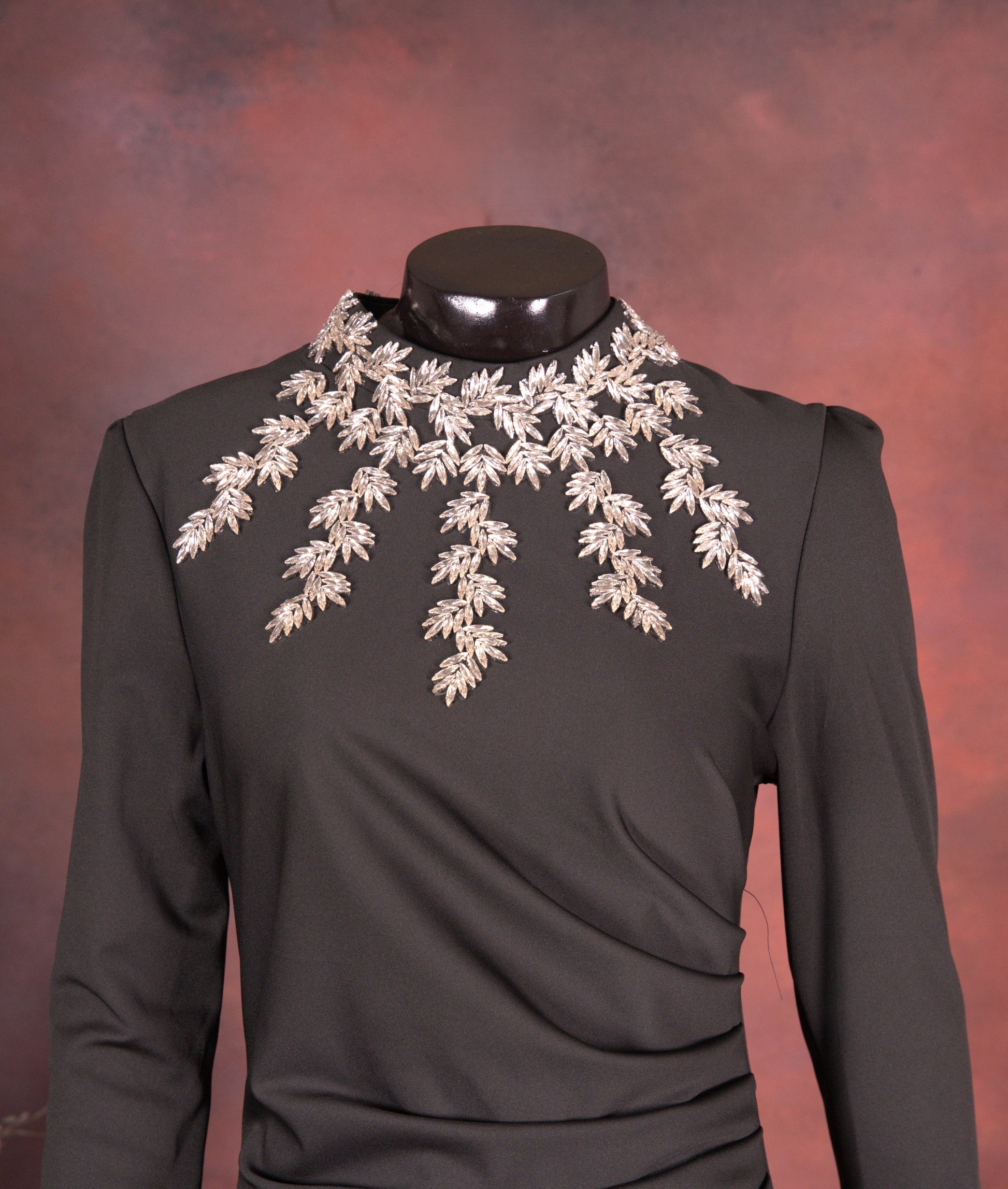 The standout element is its hand-embellished high neckline and matching cuff detailing, designed with intricate crystal and beadwork that cascades gracefully, resembling a necklace-like motif. Its full sleeves and minimalistic draping balance the opulence, making it ideal for high-profile evening events, cocktail galas, and red-carpet affairs.