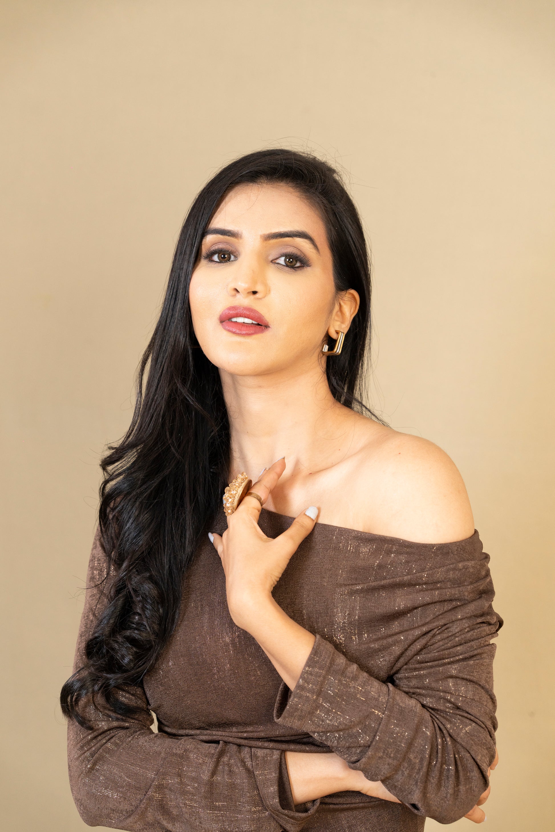 The asymmetric neckline and ruched waist detailing add a touch of modern charm, making it ideal for cocktail nights, dinner parties, or festive celebrations. Its understated shimmer enhances the rich brown tone, creating a refined yet striking look that transitions seamlessly from dusk to night.