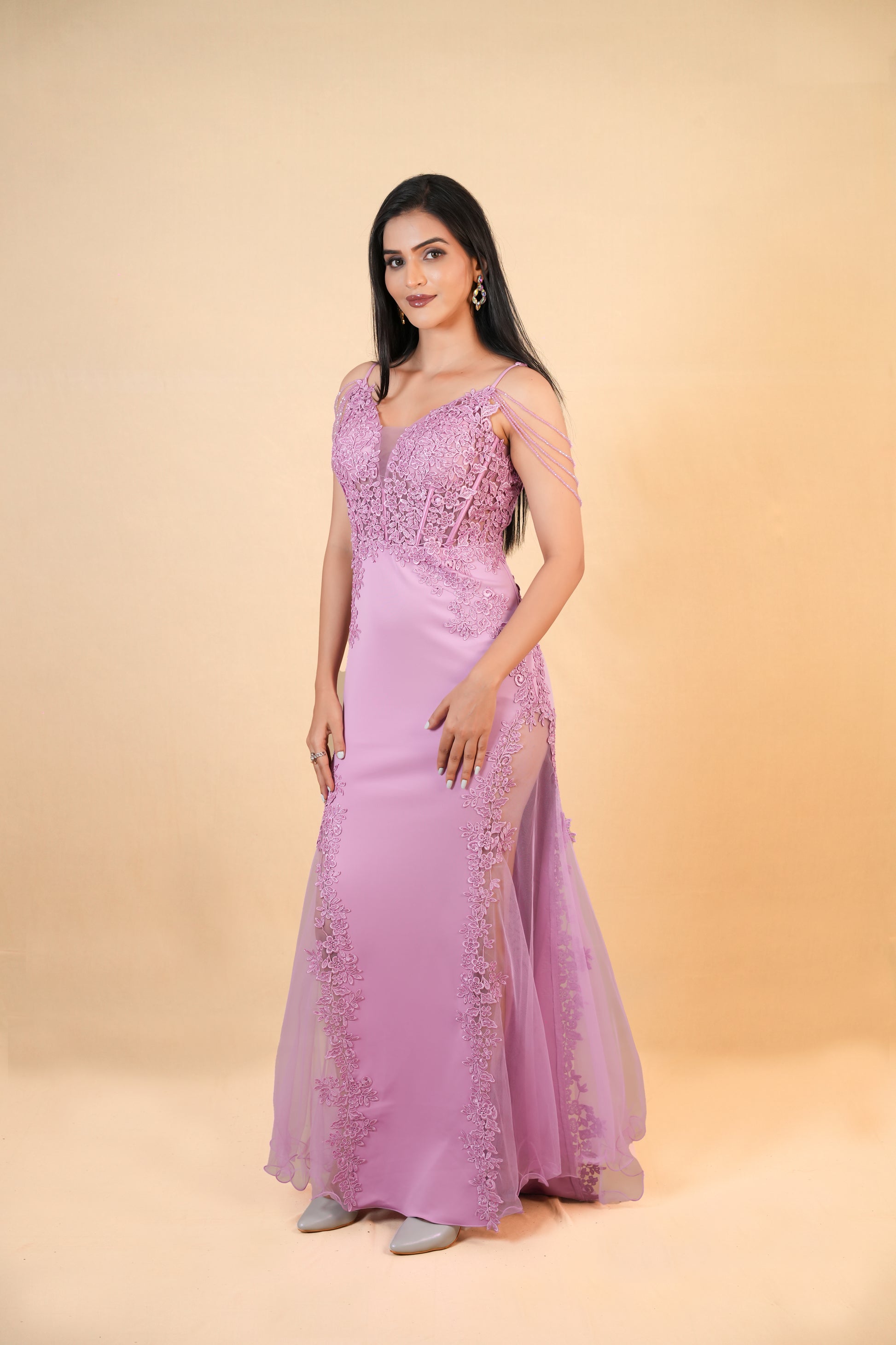 The gown features delicate floral lace detailing, beaded shoulder drapes, and a soft mesh trail that adds a dreamy, flowing finish. Its soothing pastel lavender hue complements every skin tone, making it perfect for engagements, receptions, cocktail nights, or evening galas.