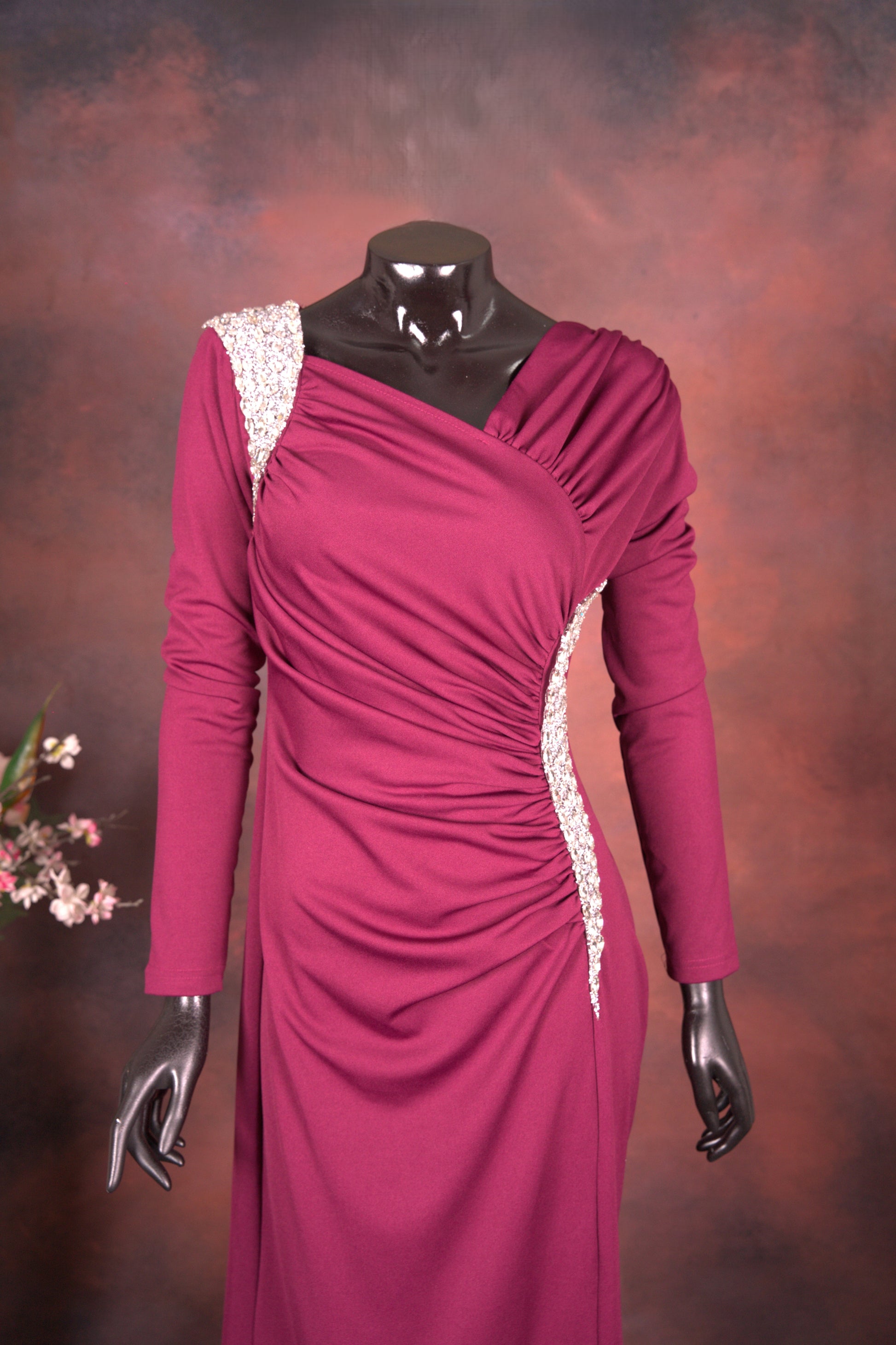 Wine Draped Gown with Crystal Accents